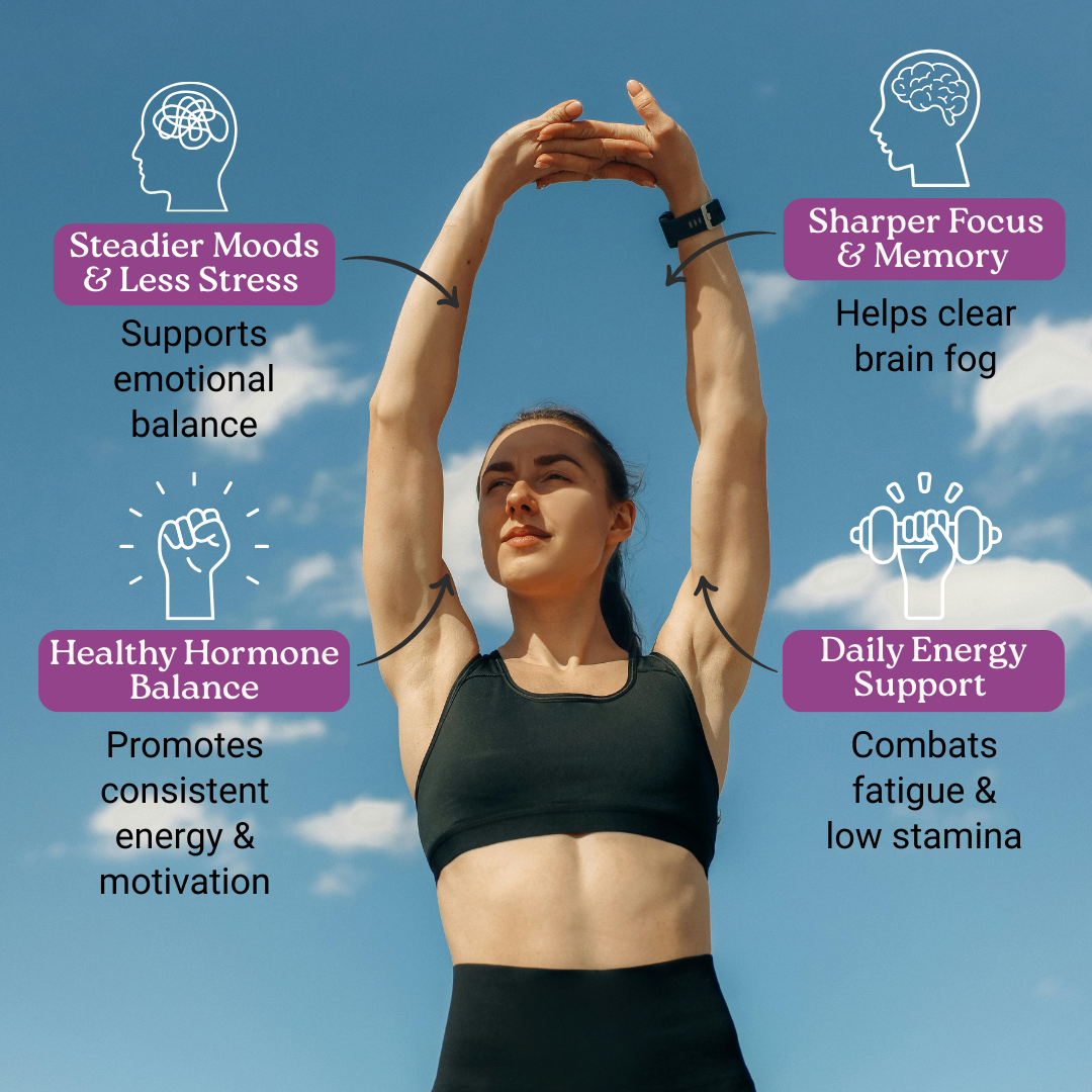 Helps regulate estrogen and cortisol levels to ease PMS, mood swings, and hormonal fatigue.