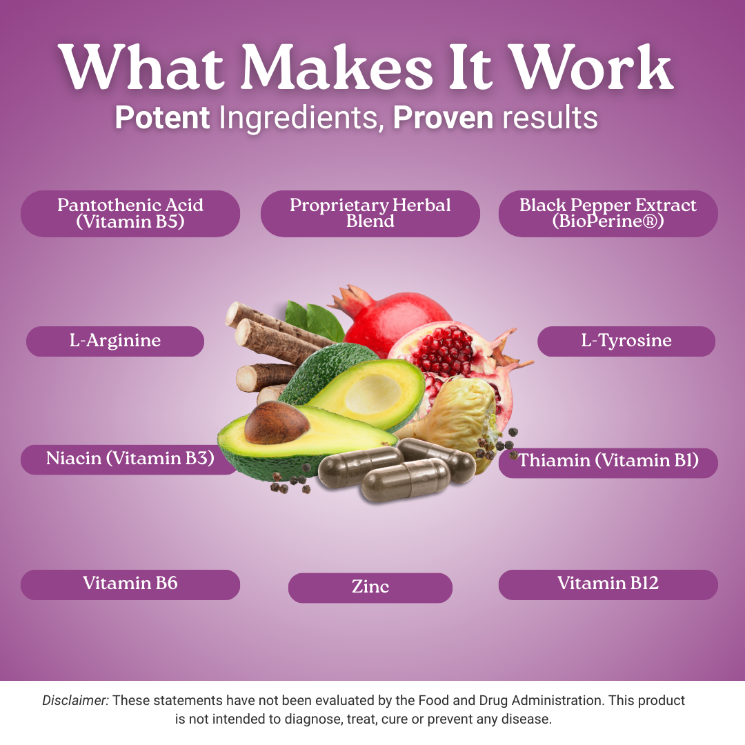 Supports adrenal health and combats exhaustion without stimulants — so you feel steady and energized all day.