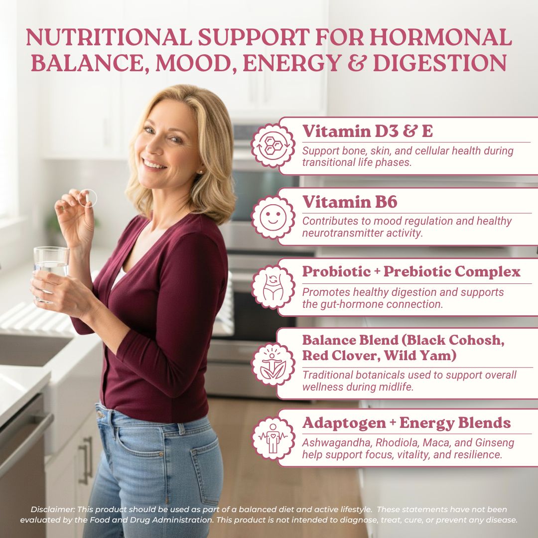 This supplement is designed to relieve a wide range of menopause and perimenopause symptoms — both physical and emotional. It helps reduce hot flashes, night sweats, mood swings, low libido, fatigue, hormonal weight gain, and irritability. At the same time, it supports energy levels, emotional resilience, and gut health, helping you feel more grounded, lighter, and in control during this phase of life.